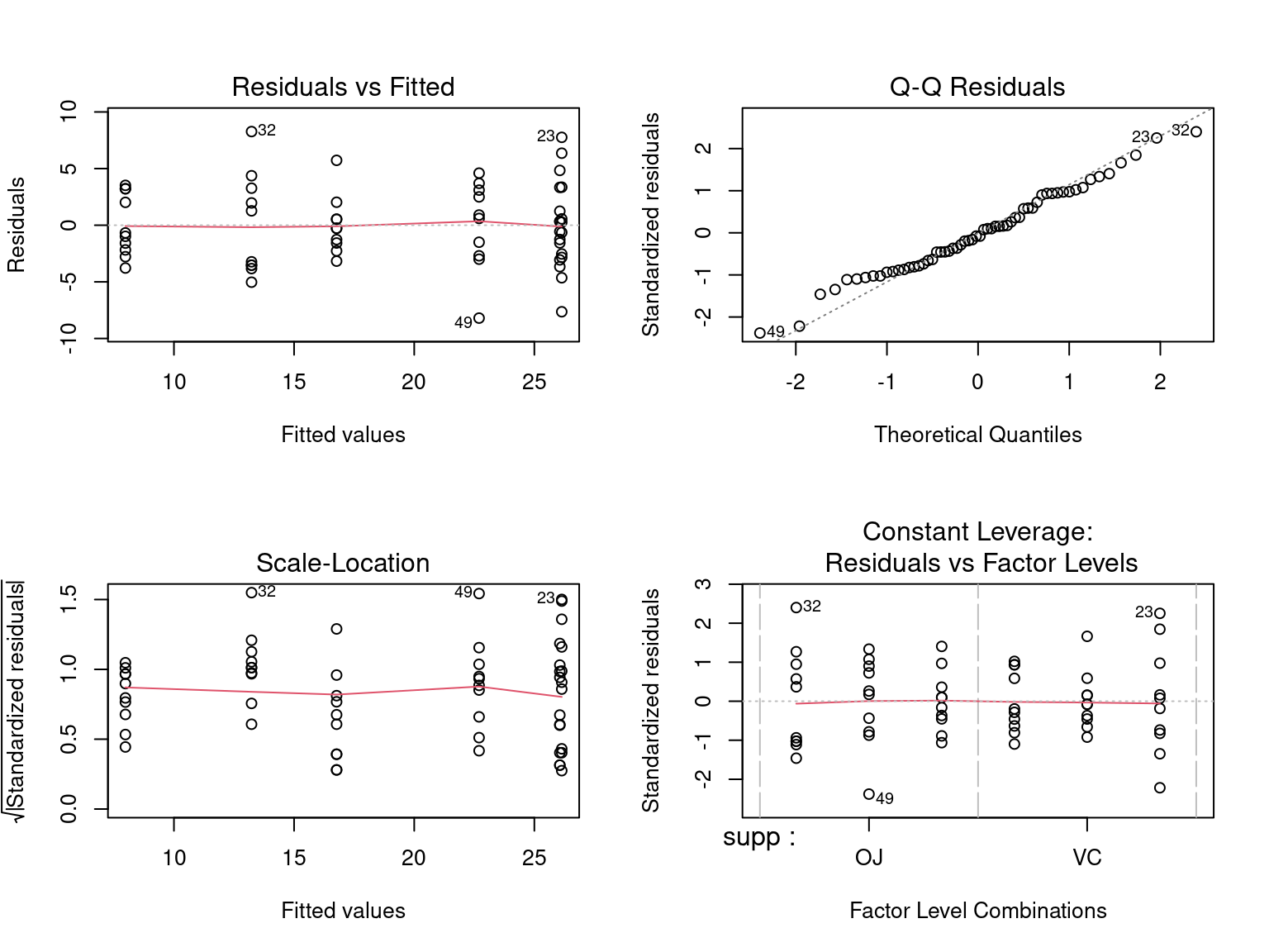 y ~ x: y is a function of xlm()~ 0 + ...)supp == VC reduces the length of the teethAn alternative way to write the above in R is: