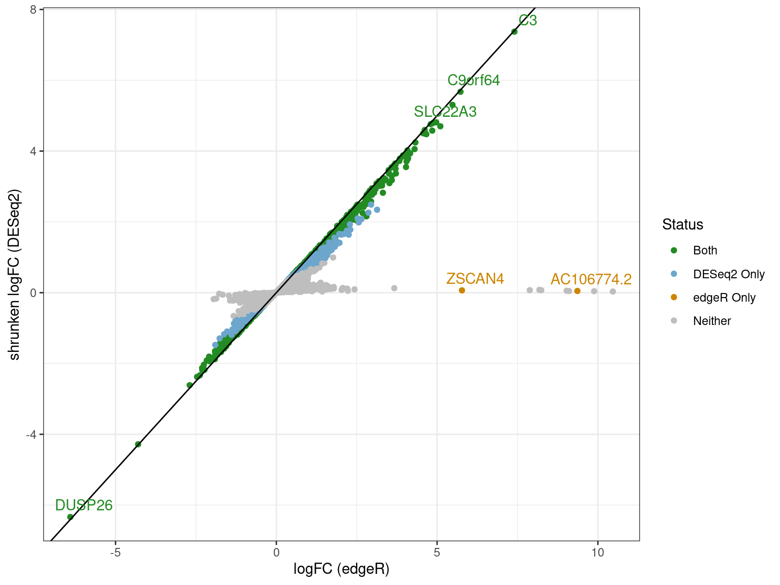 DESeq2 were a result of shrinkageDGEList using the followingedgeR results using the followingDESeq2 data structures integrate nicely with other Bioconductor packagesedgeR can also handle SummarizedExperiment objects (mostly)DESeq2 also has many options for parameter/model choice not covered hereSummarizedExperiment objects share much with SingleCellExperiment objectsSeurat (IMHO)